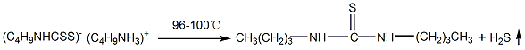2.丁基二硫代氨基甲酸丁铵盐加热至96~100℃下进行分解,放出硫化氢气体,生成二丁基硫脲。经过分离、用70~80℃热水洗涤、降温结晶、粉碎、在30~40℃下干燥,即得成品。