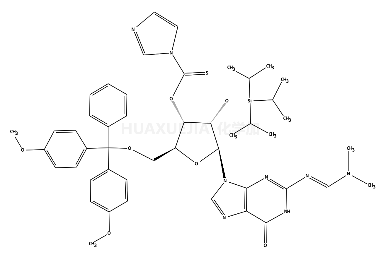 | O-((2R,3R,4R,5R)-2-((bis(4-methoxyphenyl)(phenyl)methoxy)methyl)-5-(2-((E)-((dimethylamino)methylene)amino)-6-oxo-1H-purin-9(6H)-yl)-4-((triisopropylsilyl)oxy)tetrahydrofuran-3-yl) 1H-imidazole-1-carbothioate 基本信息 | |||