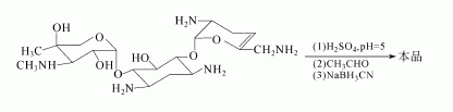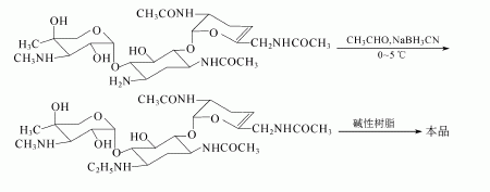 方法3:部分氨上乙酰化的西梭霉素,用乙醛和氰基硼氢化钠引入乙基后,经碱性树脂脱去乙酰基,即得奈替米星。