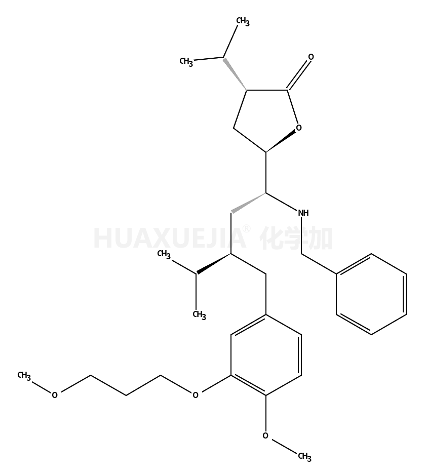 | (3S,5S)-二氢-5-[(1S,3S)-3-[[4-甲氧基-3-(3-甲氧基丙氧基)苯基]甲基]-4-甲基-1-(苄胺基)戊基]-3-异丙基-2(3H)-呋喃酮 基本信息 | |||