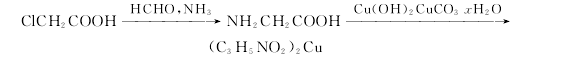 先合成甘氨酸。采用一氯乙酸为原料和甲醛、氨在低于10℃下混合,然后升至30℃,反应4H得甘氨酸。甘氨酸与碱式硫酸铜、碳酸铜存在条件下与铜离子螯合制得甘氨酸铜。反应式如下。