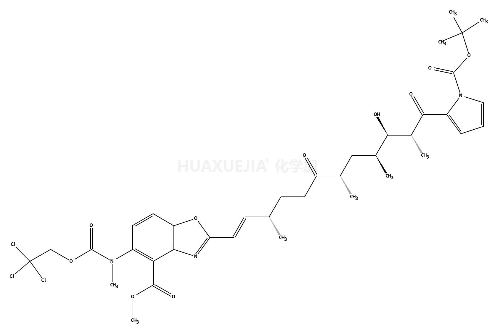 | methyl 2-((3R,7R,9R,10S,11S,E)-12-(1-(tert-butoxycarbonyl)-1H-pyrrol-2-yl)-10-hydroxy-3,7,9,11-tetramethyl-6,12-dioxododec-1-en-1-yl)-5-(methyl((2,2,2-trichloroethoxy)carbonyl)amino)benzo[d]oxazole-4-carboxylate 基本信息 | |||